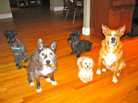 Pepper the adult Kerry Terrier on the left is quite fearful of new dogs and is learning to feel safe with my three dogs and the young puppy.  Annie my 12 year old terrier simply goes about her business with an occasional growl at the adorable pup, Coco next to her.  Coco has learned to leave Annie alone when she has a bone, not to put her paws on Sophie the scottie's back and that a gentle paw at Pablo gets him to play every time. Sophie, my scottie in the back at age 7 avoids conflict and goes about her way.  While she lets the puppy share her bed, that is the extent of her relationship with the puppy.