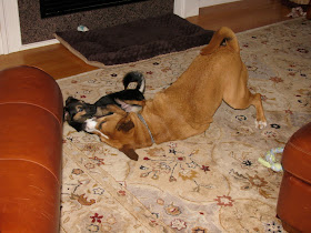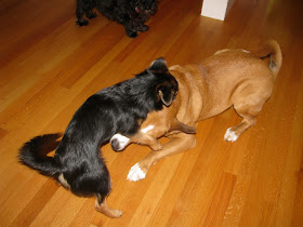 In the photo to the right, Brady the 5 month old pup was a bit worried to play with a bigger adult dog.  Pablo began to "handicap" himself getting lower and lower to encourage Baden to play with him.  I asked Pablo to take many breaks as I could tell his type of play was a bit over whelming for Baden.