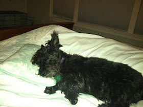 My little black foster scottie is making great progress in my home.  While he was a door dasher when he arrived, he has learned to wait and ask permission to go outside.  He has also learned to sit for affection, food or a treat.  I find it hard to believe when I work with an older dog that does not know how to sit when asked.  At six, this boy seems to love other dogs and is happy to be at someone's side.  He is learning the rules of tug, to lie down, and walk on a leash.  He is already good at riding in the car and just waits patiently in my seat while I run errands.