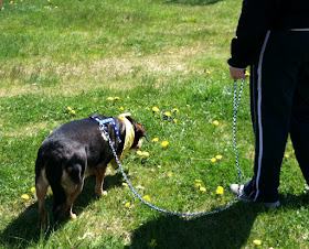Knowing how your dog is feeling in different situations will help you set him up for success.  Note in this photo, Pablo is sniffing the ground, he is uncomfortable with all the humans looking at him and has resorted to ground sniffing as it is comforting to him.  Knowing he was stressed I had my daughter play a game of "find it",  he happily ate the treats and kept a safe distance from the observers.