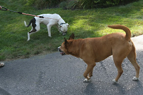 As you can see from this photo taken a few weeks earlier, these two dogs having just met are not comfortable entering each other's space and therefore are demonstrating some avoidance.  Note Bella sniffing the grass and Pablo has a high tail and fairly stiff gate. This is the dogs way of keeping themselves safe, as neither dog invited the other dog into a friendly greeting, rather are clearly ignoring each other.