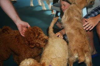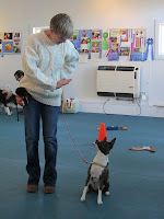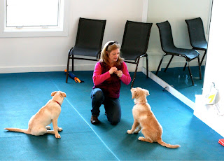 In this photo to the right the dogs are learning that they get rewarded when they offer calm behavior such as a down position.  Very quickly the dogs learn that when they are lying down the cookies begin to drop from the sky!  We then ask the dogs to move to a new spot and they again quickly offer a down knowing their behavior predicts good things!