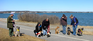 As an example of a positive training attitude,  the photo below shows a handsome dog to the far left that is fearful of people, yet he is able to give nice eye contact to his owner.  When we began with this boy, we were happy when he could simply offer a quick glance at his owner when strangers were near by. After months of positive conditioning, he is much more comfortable as you can see in this photo.